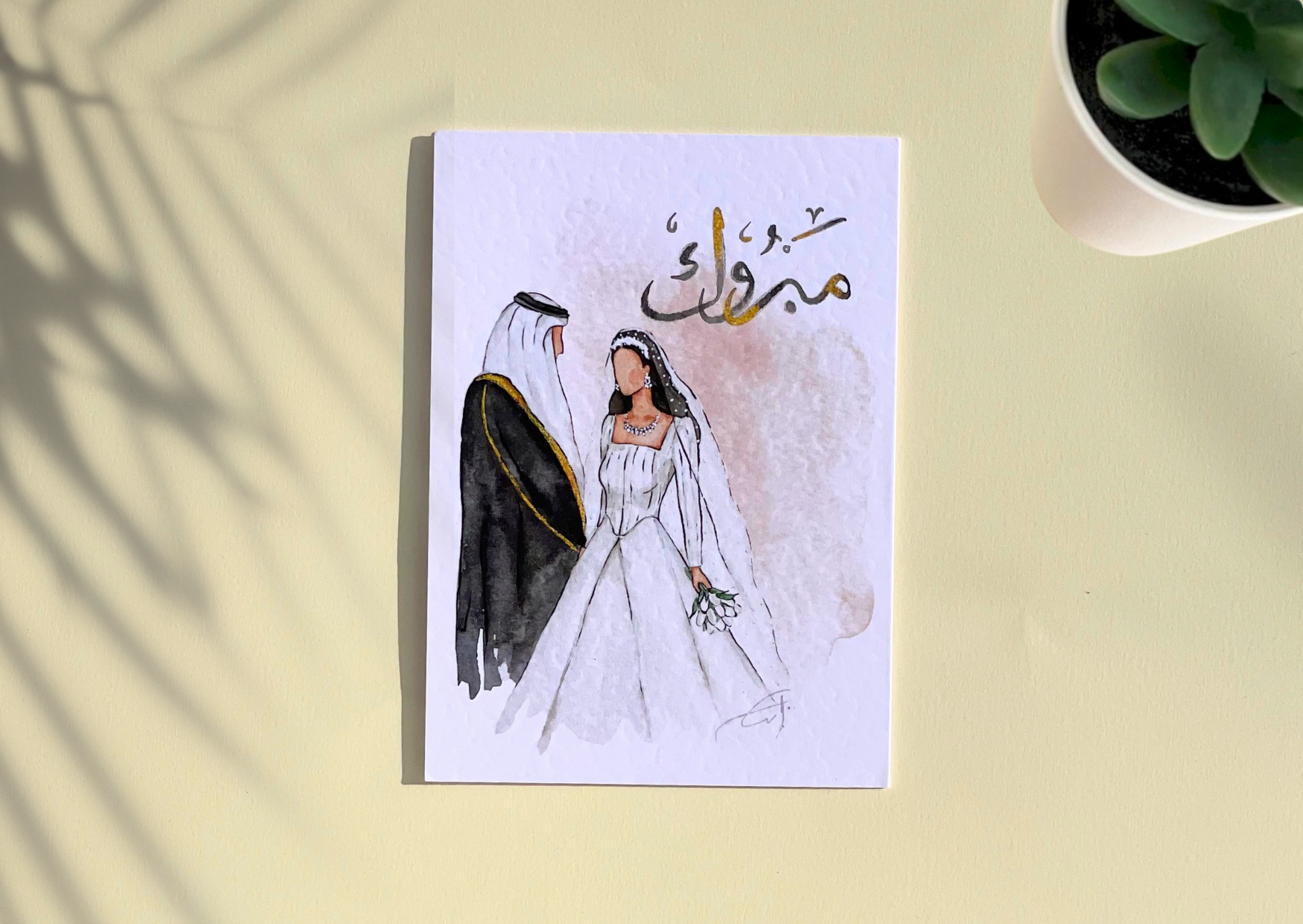 A watercolor illustration of khaleeji bride (in a white wedding dress ) and groom (in Bisht). The design is titled in Arabic with مبروك (Congratulations). Colors: black, gold white, green. Inside message: Blank. Layout: Portrait.