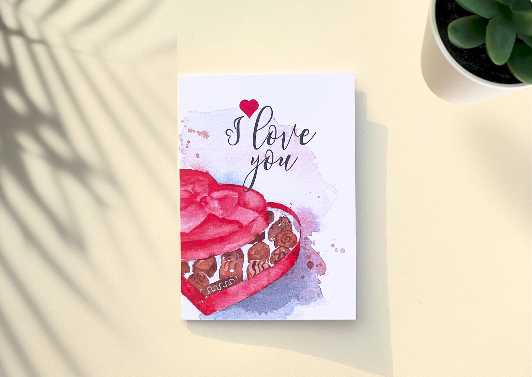 A watercolor illustration of a chocolate box titled in English with “I love you” . Colors: red, brown, blue. Inside message: Blank. Layout: portrait.