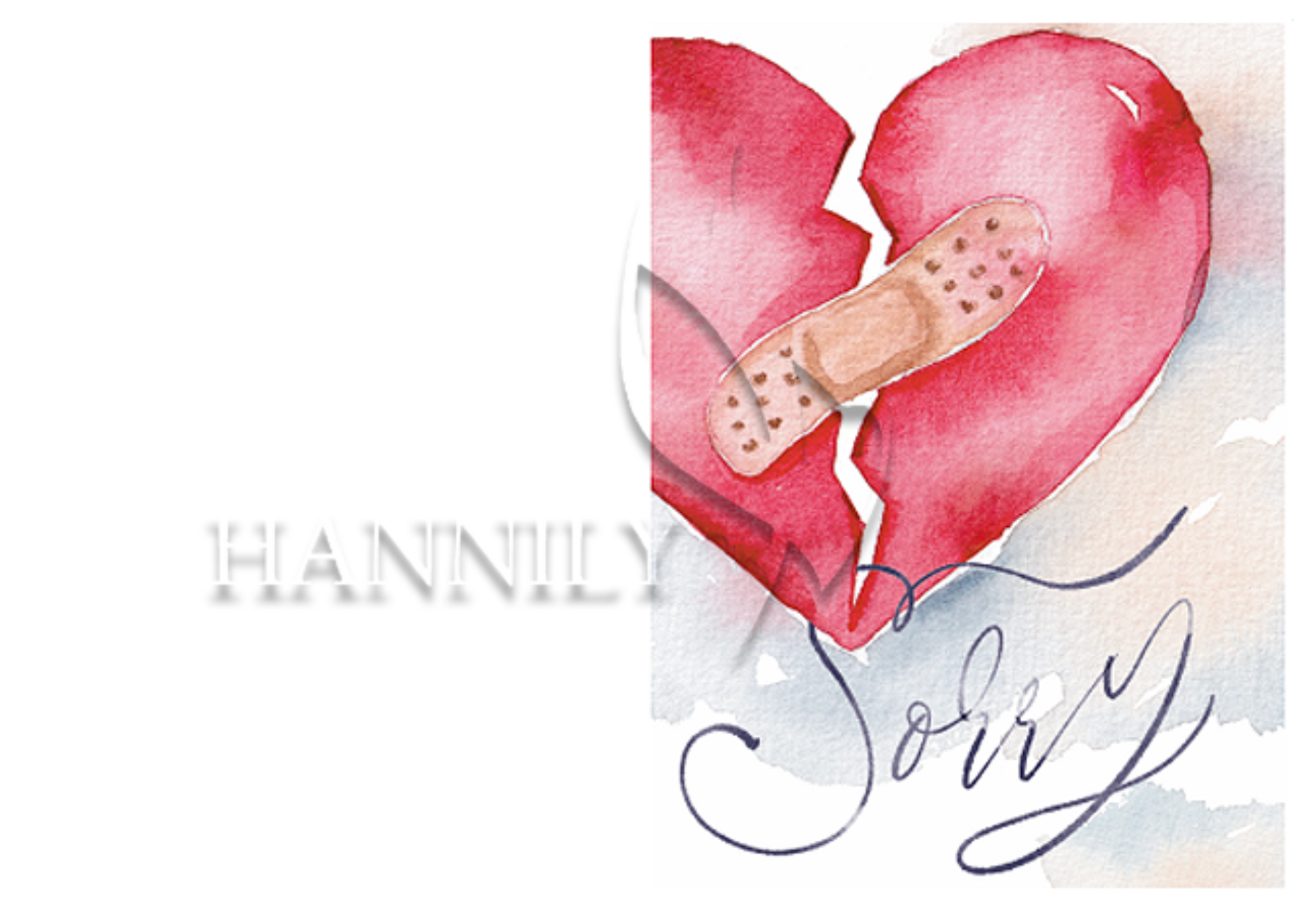 A watercolor illustration of a broken heart with a plaster bandage and titled with the word “Sorry”. Colors: Red, Black, Blue. Inside message: Blank. Layout: Portrait.